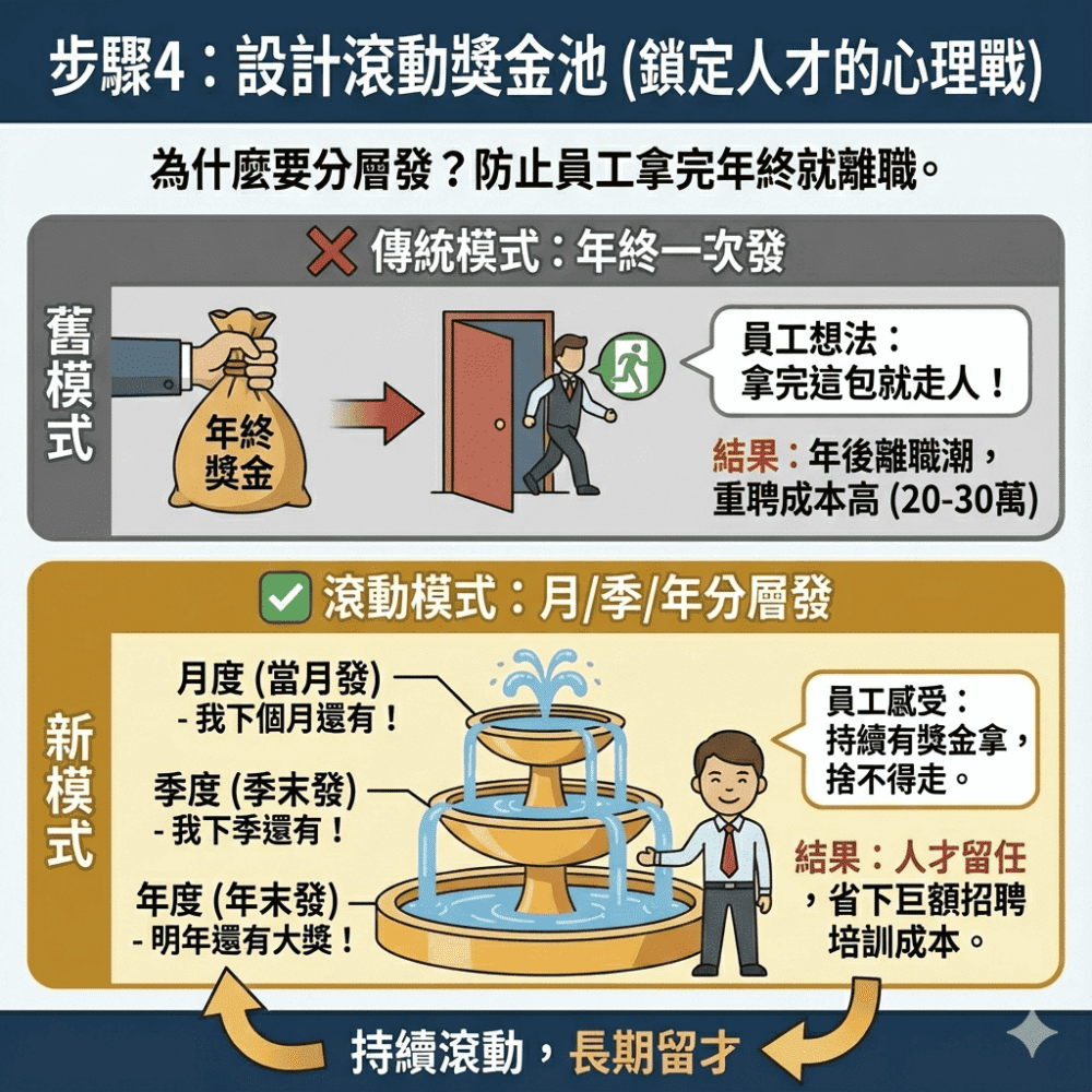 將獎金「分層發放」,是解決「拿了就走」的終極武器。透過「月度、季度、年度」的滾動式獎金,員工會為了未來的獎勵而選擇留下來。