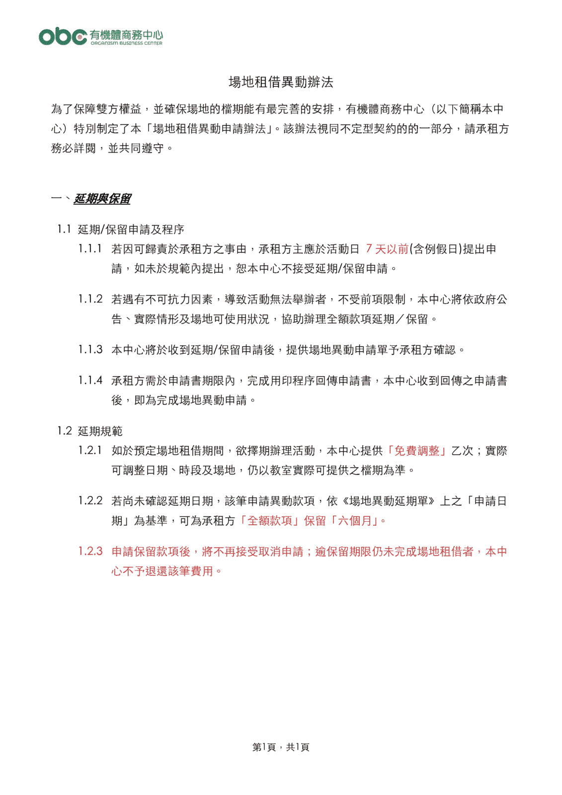 - 延期/保留 並無優先使用使用場地之權利。